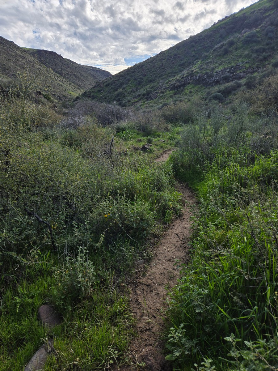 Although this area is typically brown desert, after winter rains it becomes green and lovely. Follow the rough trail through the canyon, keeping an eye out for pink ribbons and cairns to stay on the trail. You'll go through two barbed wire fences. Leave them as you found them (so, if they were closed, closed them behind you and vice versa). The trail can be a bit overgrown in places and there are some bushes with thorns on them. Long hiking pants are recommended. After 2.5 miles of a gradual descent, you'll reach the Agua Fria river. This is a seasonal river and typically has water flow during the winter and spring. The turn around point is at a lovely beach with cottonwood trees and comfy rocks to sit on and enjoy a snack.