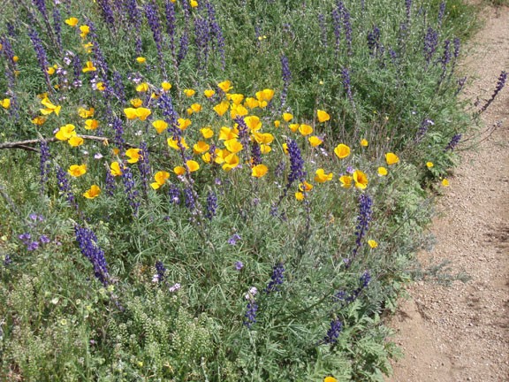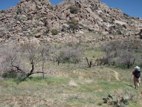 From the top of the ridge, it is easy to spot our turn around point, Ballantine creek. The trail flattens out here and passes through an old corral. If you're lucky (or planned this hike well) there is water in this seasonal creek. This is a good place to find a comfortable rock and have some lunch. As you look around, it is easy to notice that this area is recovering from previous fires. If you're observant, you probably spotted a pine tree or two in this area that managed to survive. After lunch, return the way you came.