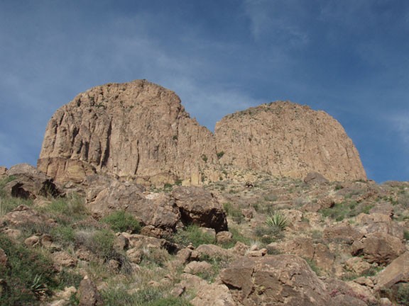 However, this adventure will require a good deal of planning and work to achieve. After acquiring the proper rope and protection gear, you'll need to hike the long approach to the base of the Weavers Needle. Details of the hike up to Freemont Saddle are here. From Freemont Saddle, you will continue walking into the depths of Boulder Canyon, with the Weavers Needle easily in sight on your right. As you walk along the trail, you will notice that Weavers Needle now morphs from one giant point into two distinct peaks. The notch between these peaks mark the start of the technical climbing portion of this ascent. Continue walking down the well worn trail in Boulder Canyon until you reach the faint trail (shown on the map) that turns off towards the notch in the needle. This turn off is marked by cairns, but is not easy to see.