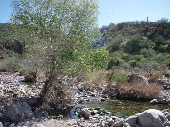 From the Phoenix area, take HWY 88 North East out of Apache Junction towards Canyon Lake. After you hit the tourist trap known as Tortilla Flats, go another 0.3 miles to a small pull off on the right. There is a rugged 4WD road down to Tortilla Creek here that marks the start of the adventure.