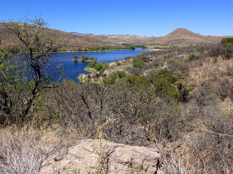 Following the signs to the Sonoita Creek trail, you'll hike through a small forest of Ocotillo trees 0.2 miles to the first signed trail junction (JCT_1R on the map). Stay right here. About a mile from the trailhead start, you'll reach the signed trail junction with the Horse Coral trail (JCT_2R on the map). Stay right again at this signed junction. The trail now drops about 0.5 miles into the canyon area and reaches Sonoita Creek. This riparian area is really lovely, and worth exploring a bit before continuing to the right on the signed return trail for the Black Hawk trail (JCT_3R on the map). This trail follows a bit off of the creek and after about a mile from the last trail junction, you'll reach a dirt road. Turn right and follow this dirt road as it becomes paved and crosses the creek. You'll get nice views of Patagonia Lake here. The paved road climbs up steeply to the trailhead and from the lake it is only about 0.2 miles to the parking area.