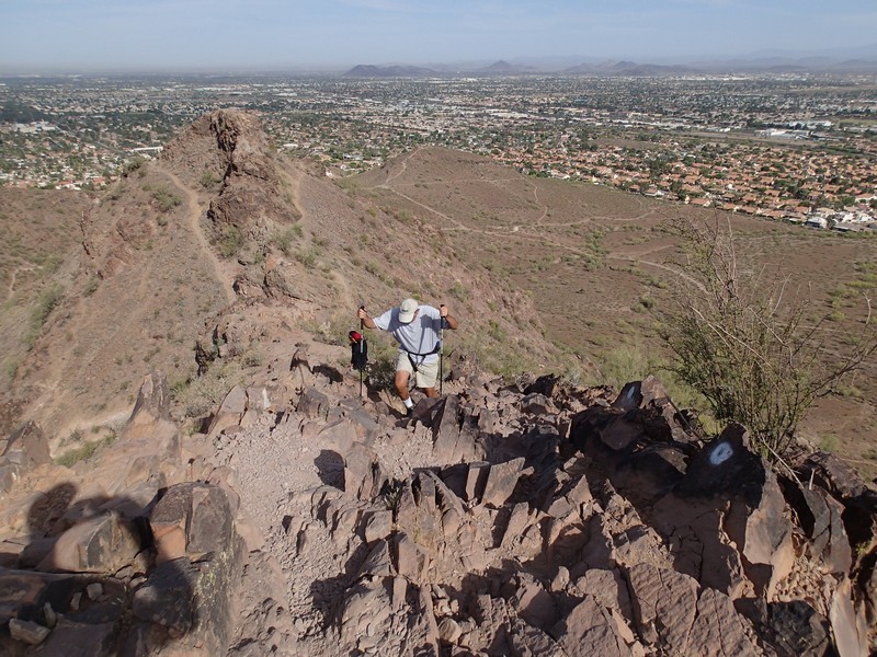 You will briefly be following the trailhead of #308 to your right before coming onto a sign marking the junction to trail #150. Follow the signed trailhead for #150. This trail heads up the side of Lookout Mountain facing the parking area. The trail climbs pretty steeply up to the top of Lookout Mountain. The trail starts out easy to follow, but as you climb higher on the mountain, there are several trails to choose from. Try to follow the signs at the junctions for #150. The trail at the top is rocky, but scrambling is not required. Eventually you end up on the short ridgeline at the top of Lookout Mountain. Views from the top of Lookout Mountain include Downtown Phoenix and the Phoenix Mountain Preserve to the south. Return the way you came.