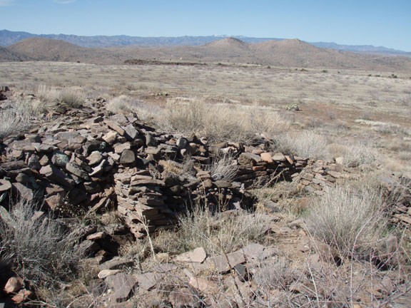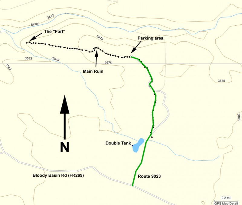From the Phoenix area, take I-17 North to the Bloody Basin exit (#259). This road (FR269) is a good graded dirt road. Bloody Basin road crosses the Agua Fria river, but the river is either low or dry most of the year and the crossing is paved. Drive 8.7 miles along this road and make a left at the signed junction for route 9023. You'll pass double tank on your left (a couple of large cow dirt water ponds) and after 0.5 miles, you'll stay left at the signed 9023 junction. At this point, the BLM calls this road a 'route'. You'll probably need a high clearance vehicle to make it to the parking area, which you'll reach after another 0.7 miles of driving. You can also park and walk it if you like. There's a trail register here, with information about the ruins.