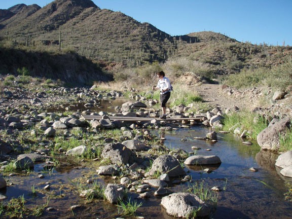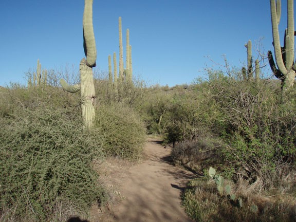 This easy to follow section of trail backtracks much closer to Cave Creek, which is frequently flowing with a little water. There are some impressive Saguaro here and the trail is a bit more secluded and scenic. You'll pass some evidence of old homesteading in the area as well as crossing the creek two more times before reaching the parking area and the start of the hike.