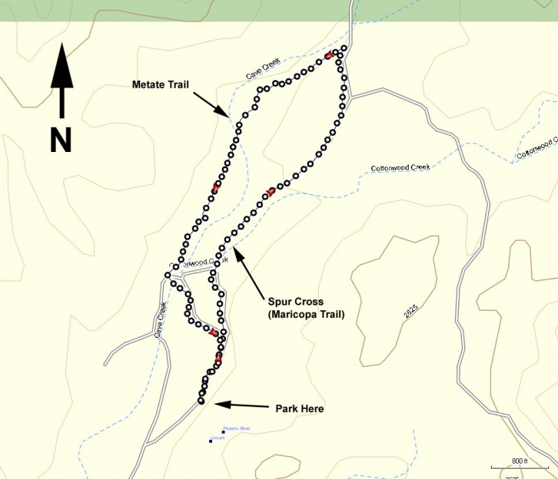 There are several trails in this area. One short, easy, and enjoyable walk is the Spur Cross (Maricopa Trail) to Metate Trail loop.